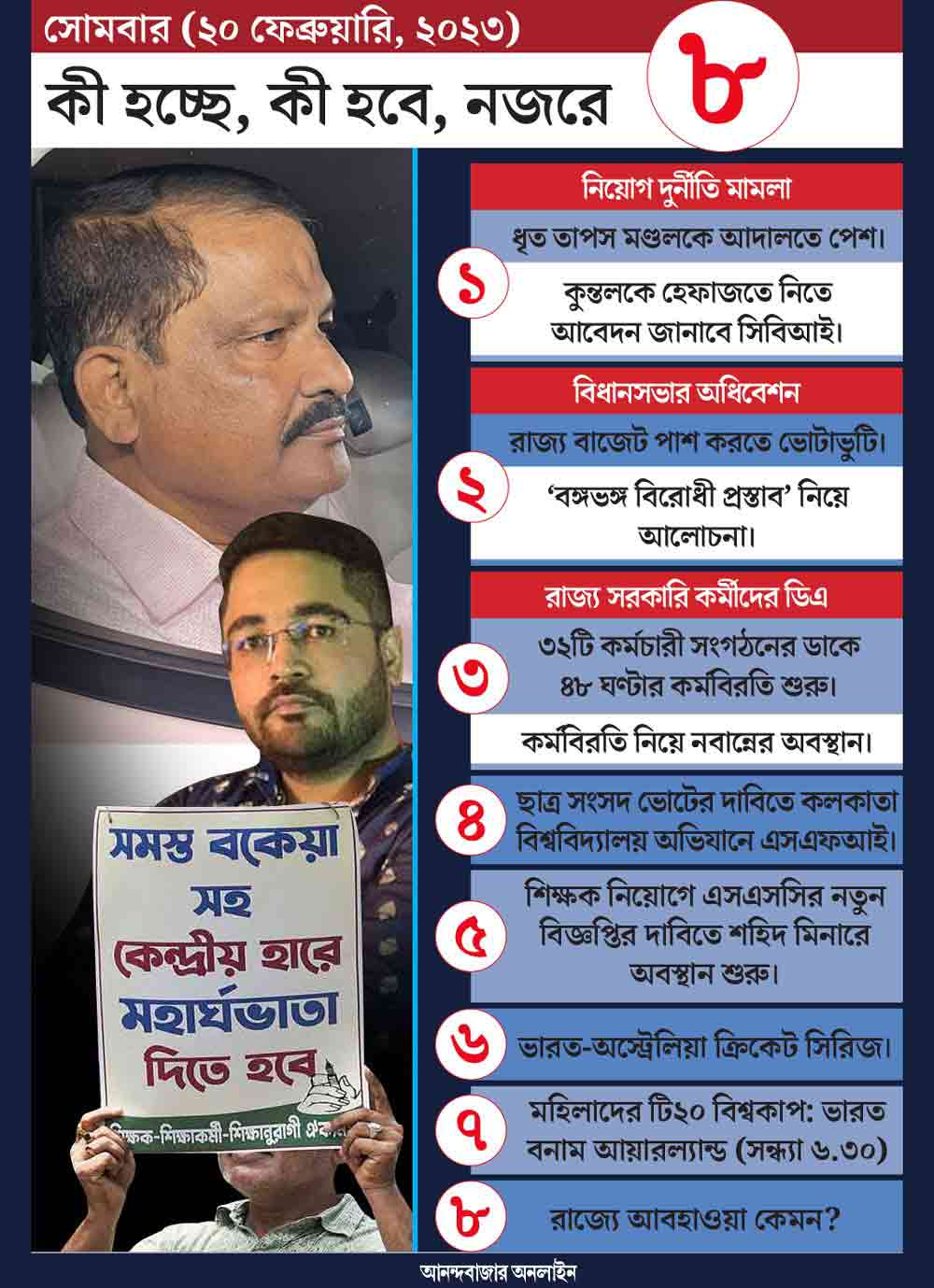 প্রাথমিকে নিয়োগ দুর্নীতি মামলায় রবিবার তাপস মণ্ডলকে গ্রেফতার করেছে সিবিআই। আজ, সোমবার তাঁকে আদালতে পেশ করানো হবে। অন্য দিকে, কুন্তল ঘোষকে আবার হেফাজতে নিতে আজ আদালতে আবেদন জানাবে সিবিআই। নজর থাকবে আদালতের এই খবরগুলির দিকে।