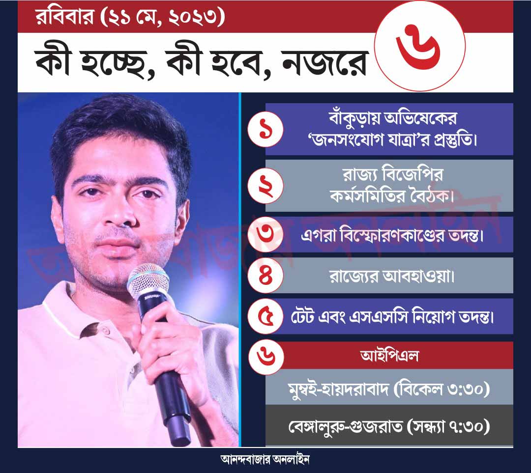 সোমবার থেকে আবার ‘জনসংযোগ যাত্রা’ শুরু করছেন তৃণমূলের সর্বভারতীয় সাধারণ সম্পাদক অভিষেক বন্দ্যোপাধ্যায়। সিবিআইয়ের ডাকে তিনি কলকাতায় এসেছিলেন। সোমবার থেকে আবার যাত্রা শুরু হবে। তার আগে আজ, রবিবার বাঁকুড়ায় অভিষেকের ‘জনসংযোগ যাত্রা’র প্রস্তুতির দিকে নজর থাকবে।