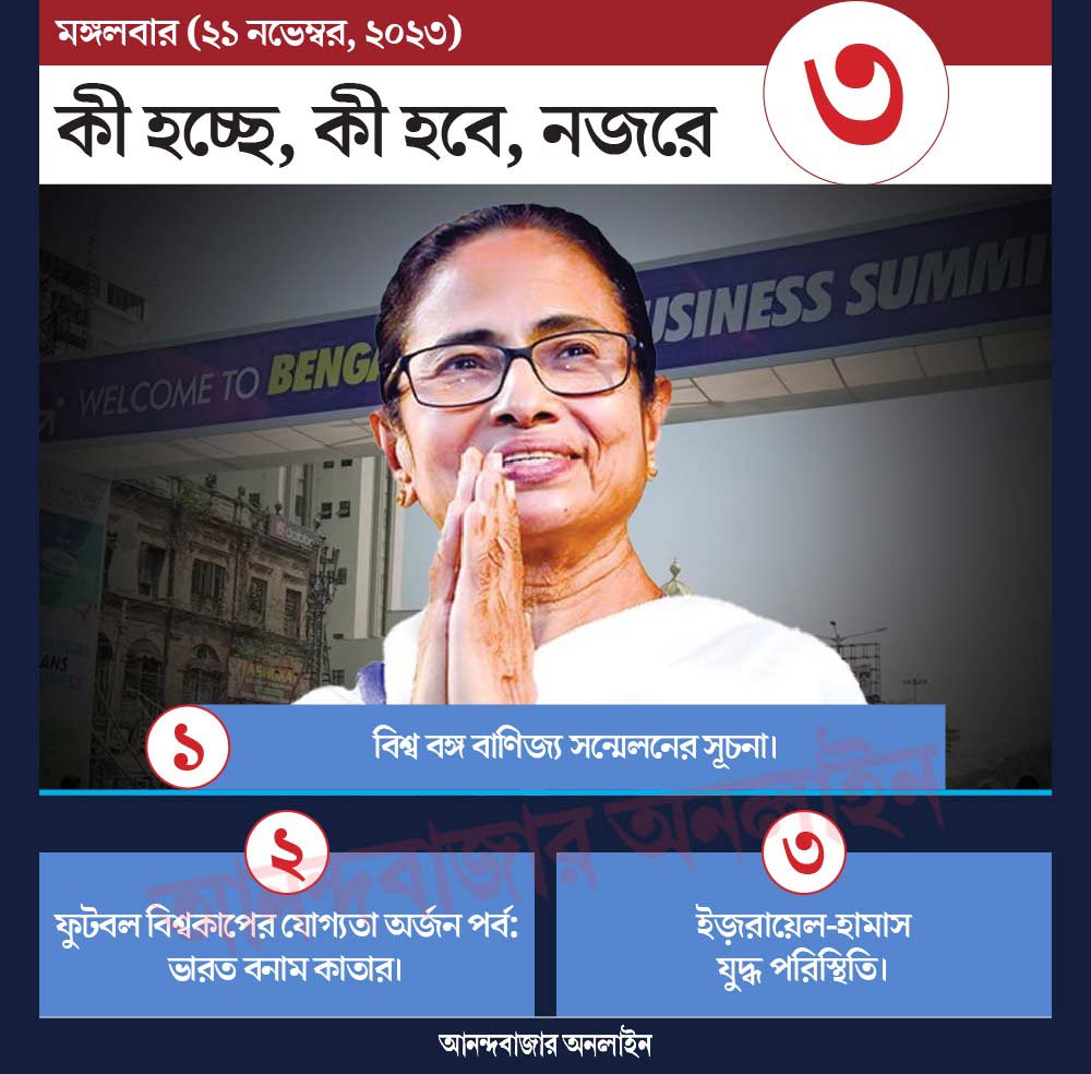 মঙ্গলবার শুরু হচ্ছে বিশ্ব বঙ্গ বাণিজ্য সম্মেলন। নিউটাউনের বিশ্ব বাংলা কনভেনশন সেন্টারে সম্মেলনের উদ্বোধন করবেন মুখ্যমন্ত্রী মমতা বন্দ্যোপাধ্যায়। মুকেশ অম্বানী, নিরঞ্জন হীরানন্দানি, হর্ষ নেওটিয়া, সঞ্জীব গোয়েন্কার মতো প্রথম সারির শিল্পপতিরা থাকবেন এই বাণিজ্য সম্মেলনে। ইংল্যান্ড, ইটালি-সহ বিভিন্ন দেশের শিল্পপতিরাও হাজির থাকবেন দু’দিনের এই কর্মসূচিতে। এই সংক্রান্ত খবরে নজর থাকবে আজ।