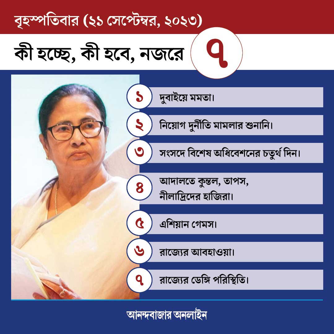 রাজ্যে ডেঙ্গি পরিস্থিতির অবনতি হচ্ছে। বুধবারও কলকাতার উপকণ্ঠে মশাবাহিত এই রোগে আক্রান্ত হয়ে মৃত্যু হয়েছে এক জনের। ভিআইপি রোডের ধারের একটি বেসরকারি হাসপাতালে দমদমের সপ্তম শ্রেণির ছাত্রীর মৃত্যু হয়েছে। চলতি মাসের শুরুর দিকে বাইপাসের বেসরকারি হাসপাতালে ডেঙ্গিতে মারা গিয়েছেন এক প্রসূতিও। জেলা থেকেও প্রায়ই ডেঙ্গিমৃত্যুর খবর আসছে। ডেঙ্গি নিয়ে আতঙ্ক ছড়াচ্ছে রাজ্য জুড়ে। এই অবস্থায় আজ রাজ্যের ডেঙ্গি পরিস্থিতির দিকে নজর থাকবে।