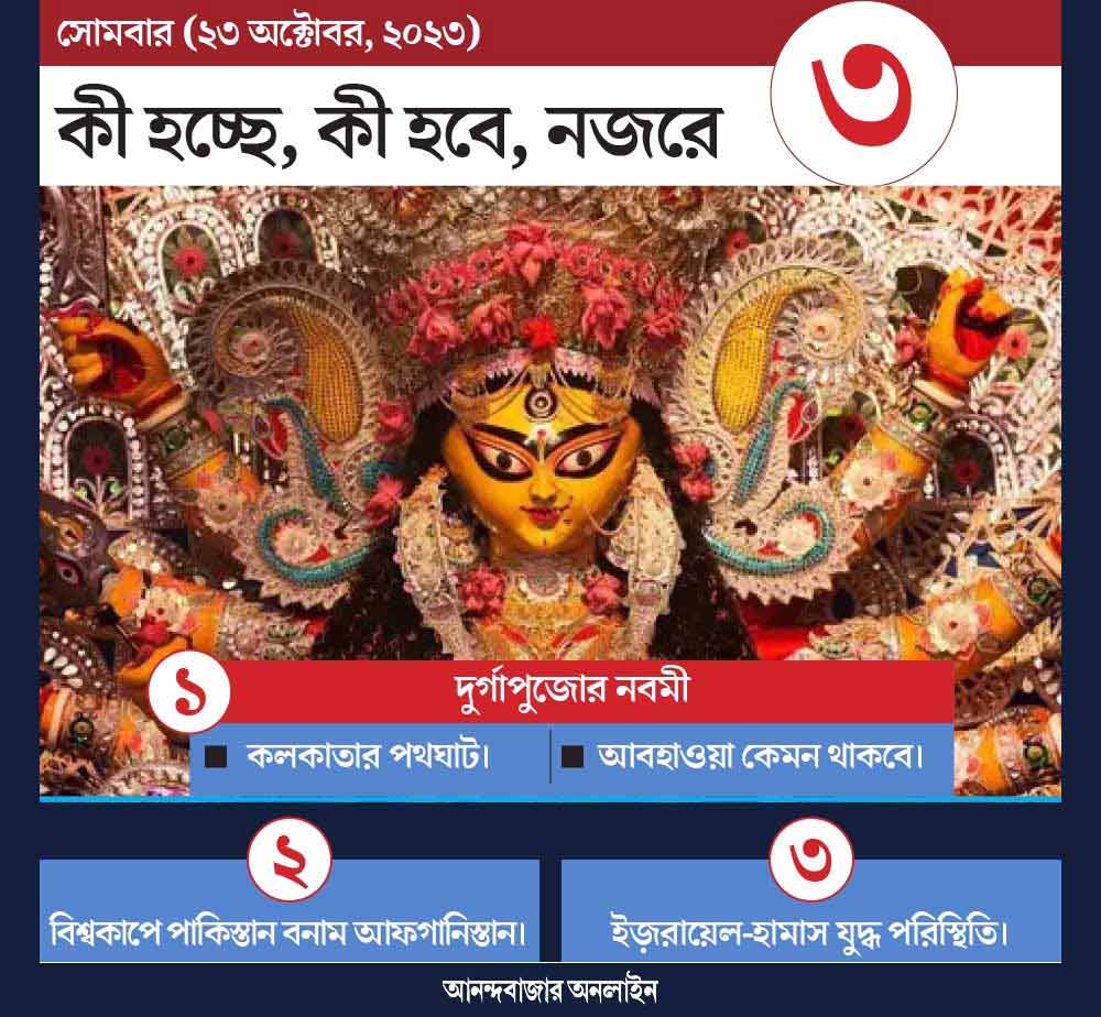 নবমী মানে পুজোর শেষবেলা। সেই শেষবেলায় সোমবার কলকাতায় জনস্রোত বইবে তা বলাইবাহুল্য। রাস্তাঘাটের অবস্থা কী হয় সে দিকে নজর থাকবে। সেইসঙ্গে নজর থাকবে আবহাওয়ার খবরে। ইতিমধ্যেই আলিপুর হওয়া অফিস নবমী ও দশমীতে রাজ্যের বেশ কিছু জেলায় বৃষ্টির পূর্বাভাস শুনিয়ে রেখেছে।