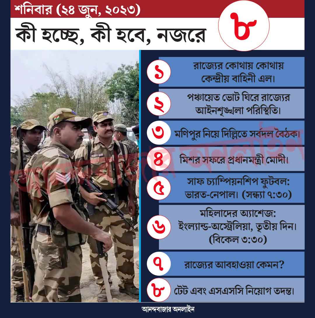 পঞ্চায়েত ভোট ঘিরে রাজ্যে বেশ কিছু অশান্তির ঘটনা ঘটছে। কিছু জায়গায় গন্ডগোল লেগেই রয়েছে। বৃহস্পতিবার পুরুলিয়ায় গুলি করে খুনের ঘটনা ঘটে। এই অবস্থায় ভোট ঘিরে আজ রাজ্যের আইনশৃঙ্খলা পরিস্থিতি দিকেও নজর থাকবে।