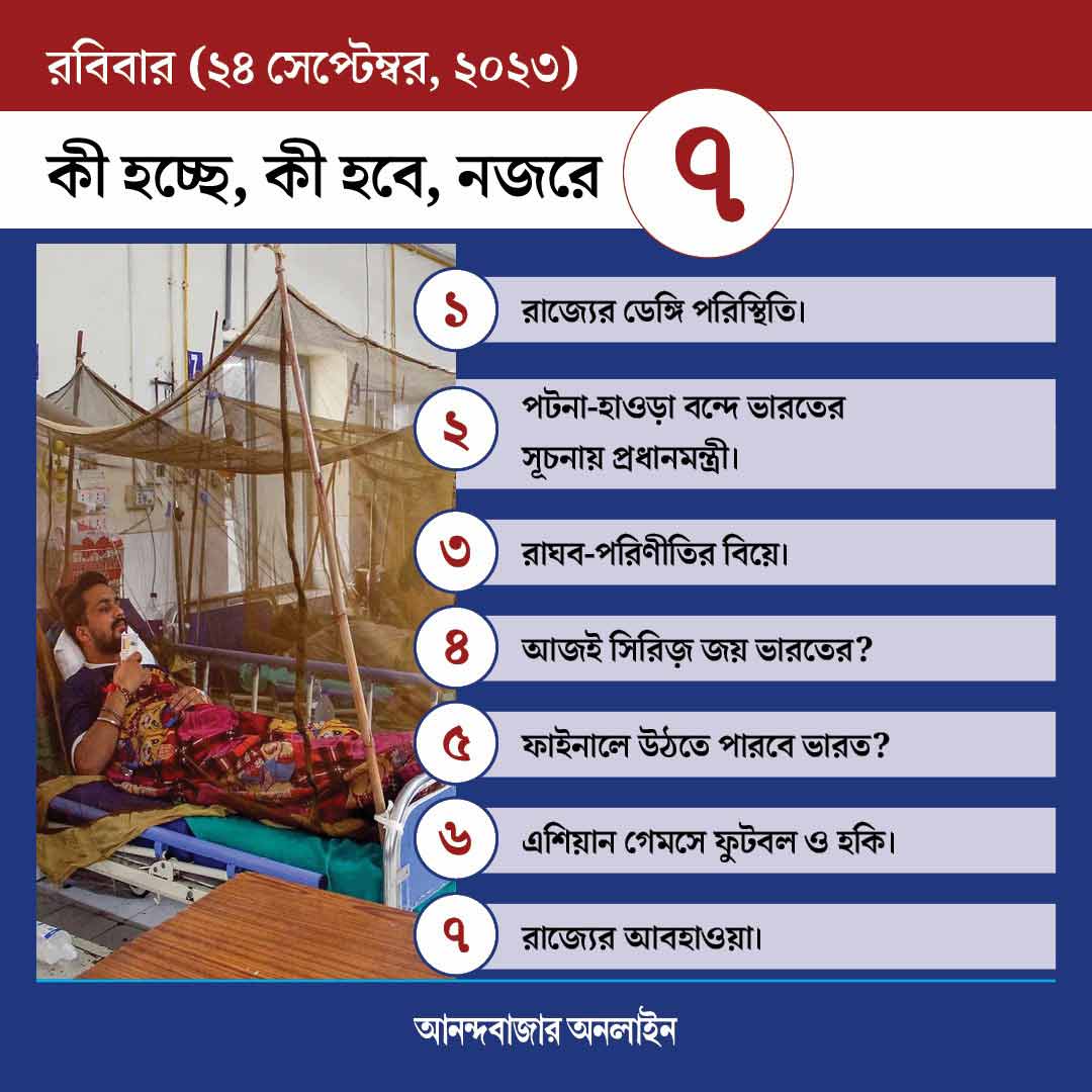 রাজ্যে ডেঙ্গি ভাইরাসে আক্রান্তের সংখ্যা ক্রমশ বাড়ছে। তিন জেলার মোট আটটি এলাকাকে চিহ্নিত করা হয়েছে ডেঙ্গি ‘হটস্পট’ হিসাবে। নদিয়া, মুর্শিদাবাদ এবং উত্তর ২৪ পরগনা, এই তিন জেলার পরিসংখ্যান স্বাস্থ্যভবনকেও চিন্তায় রেখেছে। কলকাতাতেও ডেঙ্গি আক্রান্তের সংখ্যা কম নয়। বাড়ছে মৃত্যুও। শনিবারও কলকাতায় ডেঙ্গিতে আক্রান্ত হয়ে এক জনের মৃত্যু হয়েছে। দক্ষিণ কলকাতার বিজয়গড়ের বাসিন্দা ১২ বছরের কিশোরীকে ডেঙ্গি নিয়ে এমআর বাঙুর হাসপাতালে ভর্তি করানো হয়েছিল। তার মৃত্যুর শংসাপত্রে ডেঙ্গির উল্লেখ রয়েছে। এই পরিস্থিতির দিকে আজ নজর থাকবে।