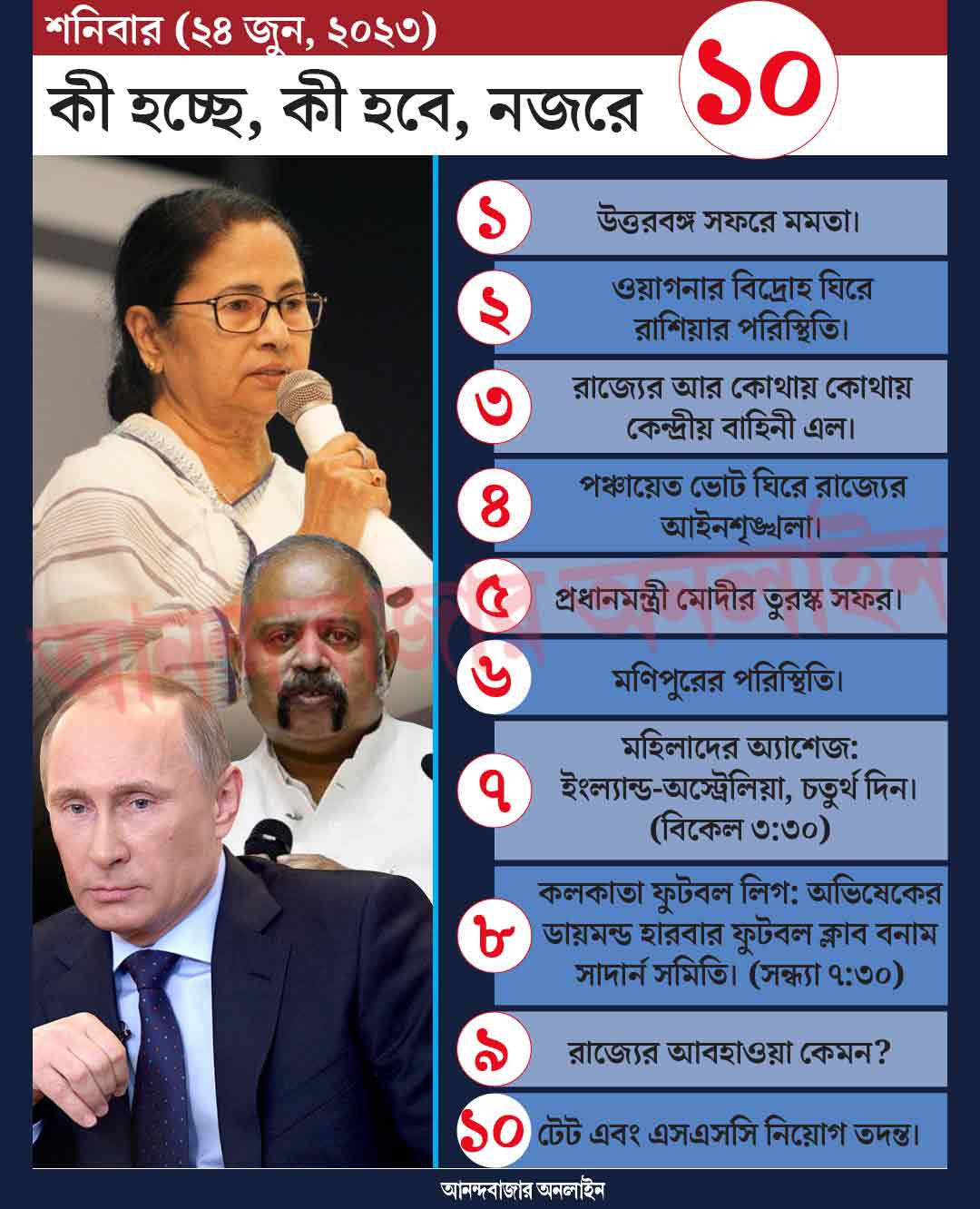 ভাড়াটে সেনা ওয়াগনারের দ্রুতগতিতে মস্কোর দিকে ধেয়ে যাওয়া আকস্মিক বিরতি। রাশিয়ার রাজধানী দখলের উদ্দেশে লিপেৎস্ক থেকে ২০০ কিলোমিটার এগিয়েও আচমকা থমকে গেল ইয়েভজেনি প্রিগোজিনের ভাড়াটে সেনাবাহিনী। কারণ হিসাবে জানানো হল, রক্তপাত এড়াতেই আপাতত মস্কো অভিযান স্থগিত।ওয়াগনার বিদ্রোহ ঘিরে রাশিয়ার পরিস্থিতির দিকে আজ নজর থাকবে।