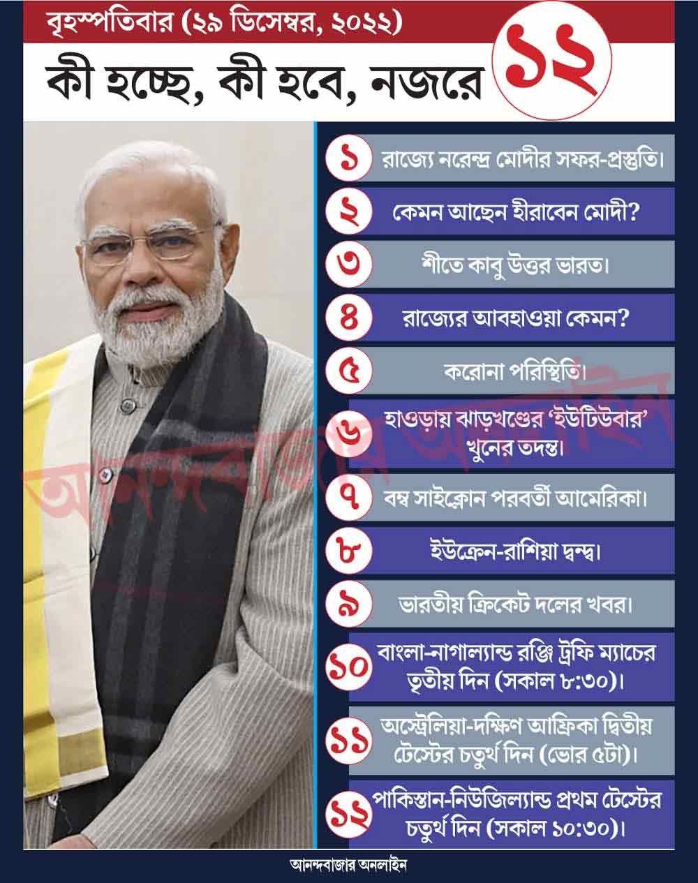 শুক্রবার রাজ্যে আসছেন প্রধানমন্ত্রী নরেন্দ্র মোদী। বন্দে ভারত এক্সপ্রেসের উদ্বোধনের পাশাপাশি একটি সরকারি কর্মসূচিতে তাঁর যোগ দেওয়ার কথা। প্রধানমন্ত্রীর এই সফর নিয়ে ইতিমধ্যে প্রস্তুতি শুরু হয়েছে। আজ, বৃহস্পতিবার এই প্রস্তুতির দিকে নজর থাকবে।