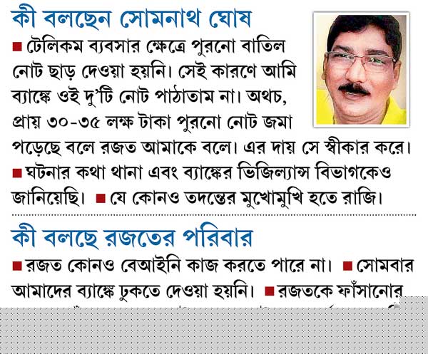 ওই শাখায় সোমনাথবাবুর তিনটি কারেন্ট অ্যাকাউন্ট রয়েছে। তাতে মাসে ৮০ লক্ষ টাকা করে লেনদেন হতো বলে তাঁর দাবি। প্রতিদিন তাঁর সংস্থার কর্মীরা ব্যাঙ্কে গিয়ে টাকা জমা দিতেন। কিন্তু ধাক্কা আসে গত নভেম্বরের গোড়ায়। কেন্দ্র পুরনো পাঁচশো এবং হাজারের নোট বাতিল করে। বাতিল নোট জমা দেওয়ার জন্য ব্যাঙ্কে দীর্ঘ লাইন পড়তে থাকে। সমস্যার কথা জানানোয় ম্যানেজারই রজতবাবুকে দিয়ে টাকা গুনিয়ে জমা করার পরামর্শ দেন বলে সোমনাথবাবুর দাবি। তিনি বলেন, ‘‘টাকা ঠিকঠাকই জমা পড়ছিল। এ মাসের গোড়ায় আয়কর দফতর চিঠি দিয়ে ৯ নভেম্বর থেকে ৩০ ডিসেম্বর পর্যন্ত আমার ওই অ্যাকাউন্টগুলিতে লেনদেনের বিবরণ চায়। তখনই গরমিলের কথা জানতে পারি।’’ সোমনাথবাবুর দাবি, রজতবাবুকে তিনি ব্যাঙ্ক স্টেটমেন্ট এনে দিতে বলেছিলেন। ৬ ফেব্রুয়ারি রজতবাবু তাঁর কাছে এসে অ্যাকাউন্টে বেশ কিছু বাতিল ৫০০ এবং ১০০০ টাকার নোটে ৩০-৩৫ লক্ষ টাকা জমা করার কথা বলেন। এর দায়ও স্বীকার করেন। সোমনাথবাবু বলেন, ‘‘আমি ব্যাঙ্কে বাতিল নোট পাঠাতাম না।’’