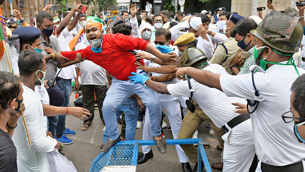যুব কংগ্রেসের নেতা-কর্মীদের সঙ্গে পুলিশের ধস্তাধস্তি। ছবি: সুমন বল্লভ
