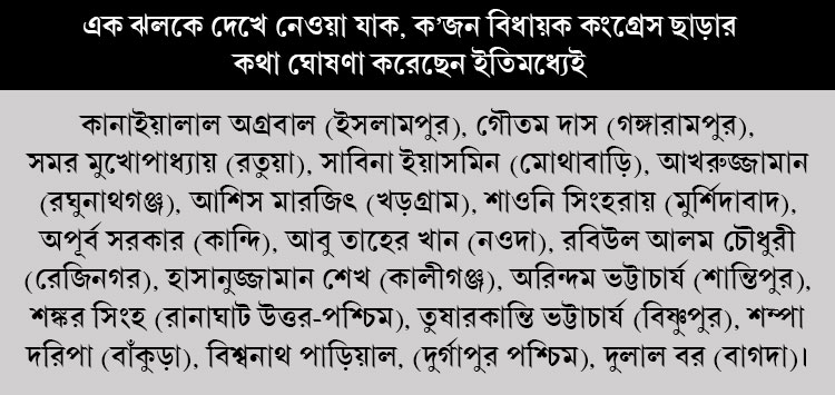 এই ২৫ বিধায়ক এখনও জোড়াফুলের পতাকা হাতে তুলে নেননি বটে। কিন্তু ফরাক্কার মইনুল হকের গতিবিধি নিয়ে অনেক দিন ধরেই সংশয়ে রয়েছেন কংগ্রেস নেতৃত্ব। দক্ষিণ মালদহের কংগ্রেস সাংসদ তথা গনি খান চৌধুরীর ভাই ডালুকে সঙ্গে নিয়ে তৃণমূল মহাসচিব পার্থ চট্টোপাধ্যায়ের বাড়ি থেকেও সম্প্রতি ঘুরে এসেছেন মইনুল। মুর্শিদাবাদ এবং মালদহের আরও বেশ কয়েক জন বিধায়ককে দলে টানতে তৃণমূল সক্রিয় হয়েছে বলেও জল্পনা।