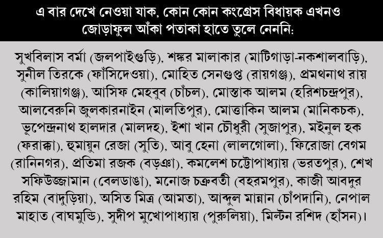 অর্থাৎ ২টি আসন উপনির্বাচনে খুইয়েছে কংগ্রেস। আর ১৭টি আসন কার্যত হাতছাড়া বিধায়কদের ‘দলবদলের’ জেরে। অধীর চৌধুরী-আব্দুল মান্নানদের হাতে তা হলে রইলেন ক’জন বিধায়ক? সাকুল্যে ২৫ জন।