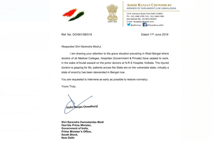 এনআরএস-কাণ্ডের পর জুনিয়র চিকিৎসকদের কর্মবিরতির জেরে ভয়ঙ্কর পরিস্থিতির মুখে বাংলা। এমন দাবি করে এ বিষয়ে প্রধানমন্ত্রী নরেন্দ্র মোদীর হস্তক্ষেপের আবেদন করলেন কংগ্রেস সাংসদ অধীর চৌধুরী।