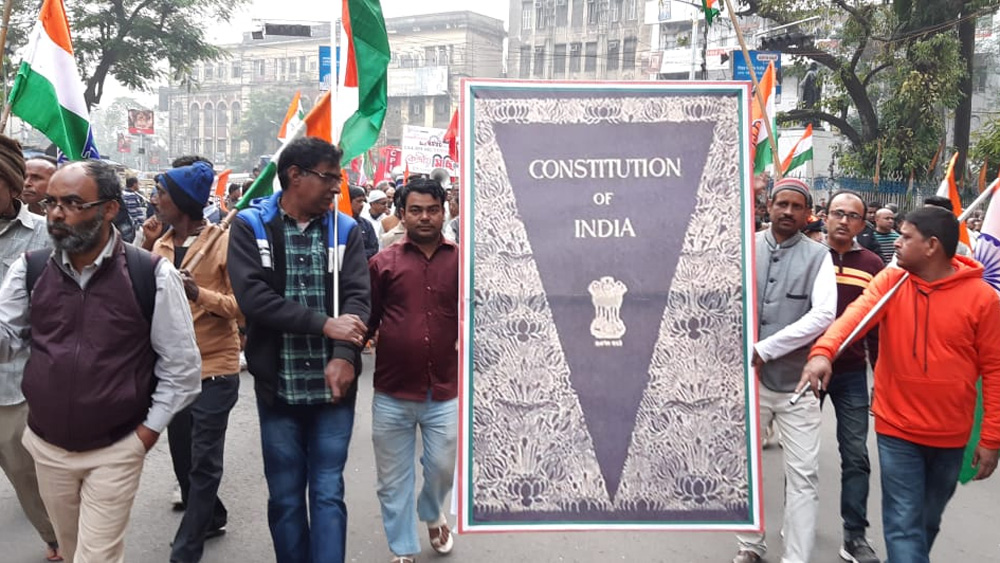 সংবিধানের প্রচ্ছদের প্রমাণ মাপের কাট-আউট নিয়ে মিছিলে শামিল প্রতিবাদীরা। —নিজস্ব চিত্র।