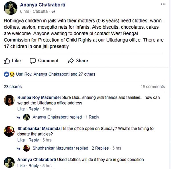 শনিবার তাঁর নিজের ফেসবুক দেওয়ালে অনন্যাদেবী লিখেছেন, ০-৬ বছর বয়সী রোহিঙ্গা শিশু, যারা তাদের মায়েদের সঙ্গে জেলে রয়েছে, তাদের জামাকাপড়, শীতের পোশাক, মশারির প্রয়োজন। পাশাপাশি বিস্কুট, চকলেট, কেকও দিতে পারেন কেউ। যদি কেউ সাহায্য করতে চান, তা হলে উল্টোডাঙায় শিশু অধিকার সুরক্ষা কমিশনের অফিসে তা পৌঁছে দিতে পারেন।