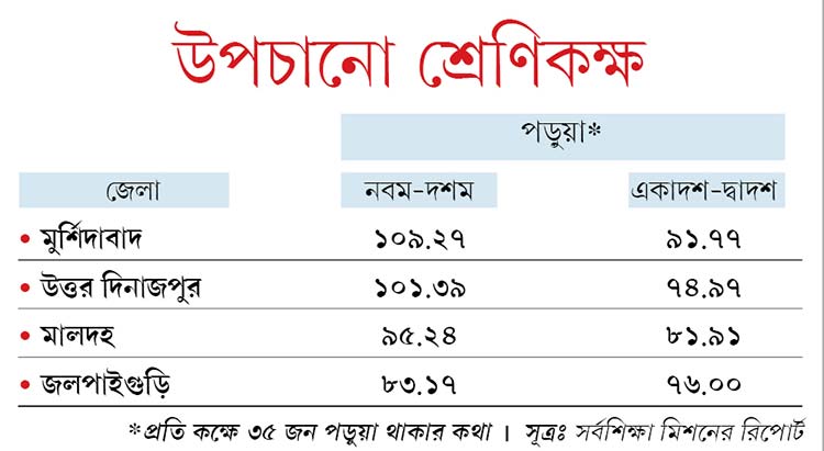 সর্বশিক্ষা মিশন সূত্রের খবর, নিয়ম অনুযায়ী প্রথম থেকে চতুর্থ শ্রেণি পর্যন্ত শ্রেণিকক্ষ পিছু ৪০ এবং পঞ্চম থেকে দশম পর্যন্ত ৩৫ জন করে থাকার কথা। অথচ দেখা গিয়েছে, প্রথম থেকে অষ্টম শ্রেণি পর্যন্ত পড়ুয়া ও শ্রেণিকক্ষের অনুপাত যথেষ্ট কম। কিন্তু নবম-দশম ও একাদশ-দ্বাদশ শ্রেণিতে এক-একটি শ্রেণিকক্ষে অনুপাতের থেকে অনেক বেশি পড়ুয়া রয়েছে। ওই রিপোর্টে প্রকাশ, মুর্শিদাবাদ, উত্তর দিনাজপুর, দক্ষিণ ২৪ পরগনা, নদিয়া, বাঁকুড়া, বীরভূম, মালদহের মতো প্রায় সমস্ত জেলায় (ব্যতিক্রম কলকাতা) গড়ে একটি ক্লাসে গড়ে ৭০ থেকে ১০০ জন করে পড়ুয়া থাকে। এটা