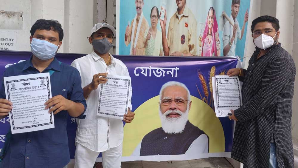 গ্যাস ও পেট্রলের দাম বৃদ্ধির প্রতিবাদে দিল্লিতে প্রধানমন্ত্রীর দফতরে ওই সব পণ্যের ‘শ্রাদ্ধে’র নিমন্ত্রণ কার্ড পাঠালেন একদল তৃণমূল কর্মী। মঙ্গলবার কলকাতার জিপিও থেকে দিল্লিতেপাঠানো হয়েছে এই কার্ডটি। আমন্ত্রণপত্রটি তৈরি করা হয়েছে, একেবারে শ্রাদ্ধের কার্ডের আদলে।