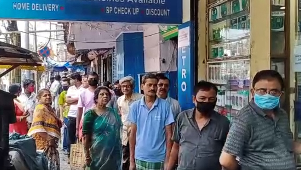 যেমন, কয়েকশো মানুষের লম্বা লাইন দেখা গেল শ্যামবাজার পাঁচ মাথার মোড়ে একটি ওষুধের দোকানে। সবাই গায়ে গায়ে দাঁড়িয়ে। এক জন বলেন, ‘‘দোকান খোলার আগে থেকেই দাঁড়িয়ে আছি লাইনে।” ওই ওষুধের দোকানের এক কর্মী অভিযোগ করেন, ‘‘আমরা বলেছি, দোকান খোলা থাকবে তা-ও মানুষ ভিড় করে রয়েছেন। তাঁদের বলছি একটু দূরত্ব বজায় রেখে দাঁড়াতে। তা-ও মানছেন না তাঁরা।” পাঁচ মাথার মোড়ে কর্তব্যরত এক পুলিশ অফিসারও বলেন, ‘‘অনেক বার বলা হয়েছে, আপনারা একটু দূরে দূরে দাঁড়ান। কেউ কথা শুনছেন না।”