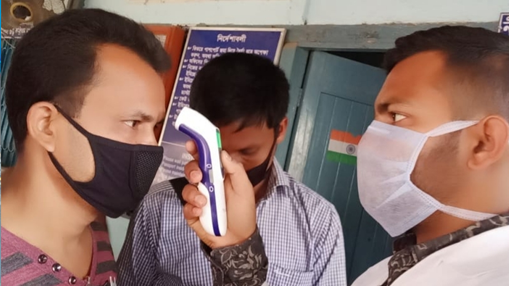 ভারত-বাংলাদেশ সীমান্তে মালদহের মহদিপুর স্থলবন্দরে থার্মাল স্ক্রিনিং চলছে। ছবি: পিটিআই।
