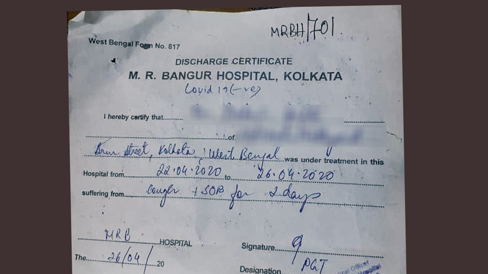 সেই অনুযায়ী ২৬ এপ্রিল রাত ১০টার সময় এমআর বাঙুর হাসপাতাল থেকে ছেড়ে দেওয়া হয় ওই বৃদ্ধকে। হাসপাতালের ডিসচার্জ সার্টিফিকেটে লেখা— রোগীর ‘কোভিড নেগেটিভ’। বৃ্দ্ধের ছেলে বলেন, ‘‘আমরা নিশ্চিন্ত মনে বাবাকে নিয়ে আসি। বাড়িতে সবার সঙ্গেই ছিলেন বাবা। বাড়িতে রয়েছেন আমার ৬৩ বছরের মা, স্ত্রী, ৭ মাসের ছেলে এবং ৬ বছরের মেয়ে।”