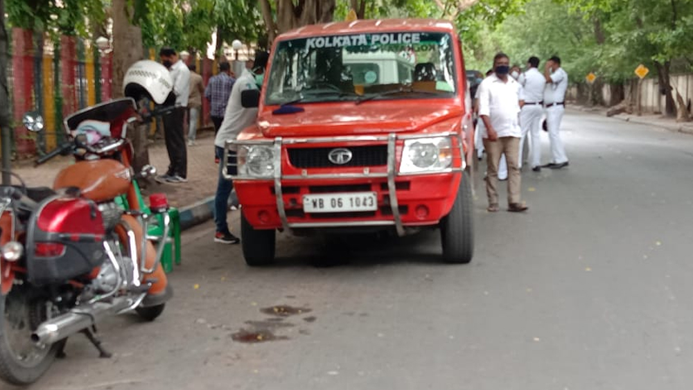 দূরে দাঁড়িয়ে কলকাতা পুলিশের ভ্যান।