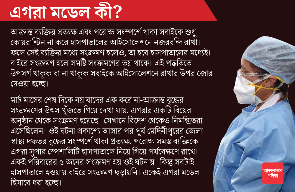 এগরা মডেল সফল ভাবে এখনও পর্যন্ত সংক্রমণ রুখতে পেরেছে পূর্ব মেদিনীপুরে। তাই সেই মডেল অনুসরণ করেই করোনার নতুন সংক্রমণ রোখার পরিকল্পনা করছে রাজ্য। শুক্রবার নবান্ন সভাঘরে প্রতিটি জেলার জেলাশাসক, পুলিশ সুপার এবং মুখ্য স্বাস্থ্য আধিকারিকদের সঙ্গে বৈঠকে মুখ্যমন্ত্রী মমতা বন্দ্যোপাধ্যায় সেই ইঙ্গিত দিয়েছেন। কোনও আক্রান্তের সংস্পর্শে আসা সকলকেই কোয়রান্টিনে রাখার উপরেও গুরুত্ব দিয়েছেন মুখ্যমন্ত্রী।