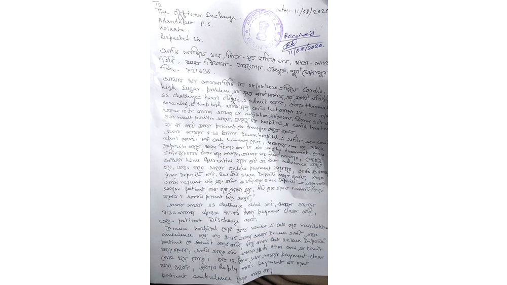 সেই প্রশ্নের ভিত গড়ে দিয়েছে স্বাস্থ্য কমিশনের একের পর এক অ্যাডভাইজ়রির পরেও বেসরকারি হাসপাতালগুলির উদাসীনতা। শনিবারই কমিশন অ্যাডভাইজ়রিতে জানিয়েছিল, কোভিড আক্রান্ত রোগীর পরিজনের কাছে সর্বোচ্চ ৫০ হাজার টাকা বা আনুমানিক চিকিৎসা খরচের ২০ শতাংশের বেশি টাকা নেওয়া যাবে না (এত টাকাই বা জমা দিতে হবে কেন, সে প্রশ্নও উঠেছে তখনই)। তবে পরিবারের কাছে টাকা না-থাকলে আক্রান্তকে ভর্তি করে ১২ ঘণ্টা সময় দেওয়ার কথাও অ্যাডভাইজ়রিতে উল্লেখ রয়েছে। শুক্রবার স্বাস্থ্য ভবনও একটি অ্যাডভাইজ়রিতে রোগীকে স্থিতিশীল করে স্থানান্তর করার জন্য নার্সিংহোম এবং বেসরকারি হাসপাতালকে বলেছিল। হাসপাতাল থেকে কোভিড রোগীকে ফেরানো যাবে না বলে তারও আগে হুঁশিয়ারি দিয়েছে রাজ্য স্বাস্থ্য দফতর। কিন্তু আনন্দপুর থানায় হাসপাতালের বিরুদ্ধে লিখিত অভিযোগে ছেলে নাজিম খান ঘটনাক্রমের যে বিবরণ দিয়েছেন, তা এই সকল পদক্ষেপকে প্রশ্নের মুখে দাঁড় করিয়ে দিয়েছে।