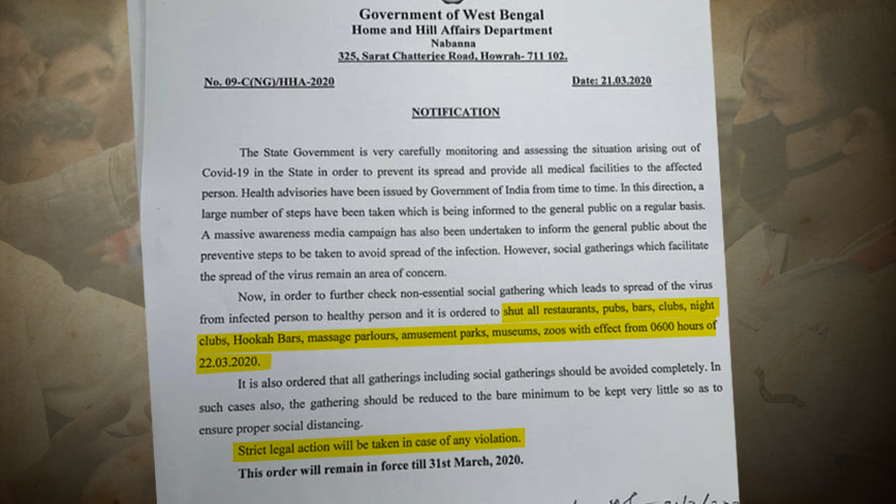 • আগামিকাল সকাল ৬টা থেকে ৩১ মার্চ পর্যন্ত রাজ্যের সমস্ত নাইটক্লাব, পানশালা, রেস্তরাঁ, মাসাজ পার্লর, বিনোদন পার্ক, মিউজিয়াম এবং চিড়িয়াখানা বন্ধ রাখার নির্দেশ দেওয়া হয়েছে।