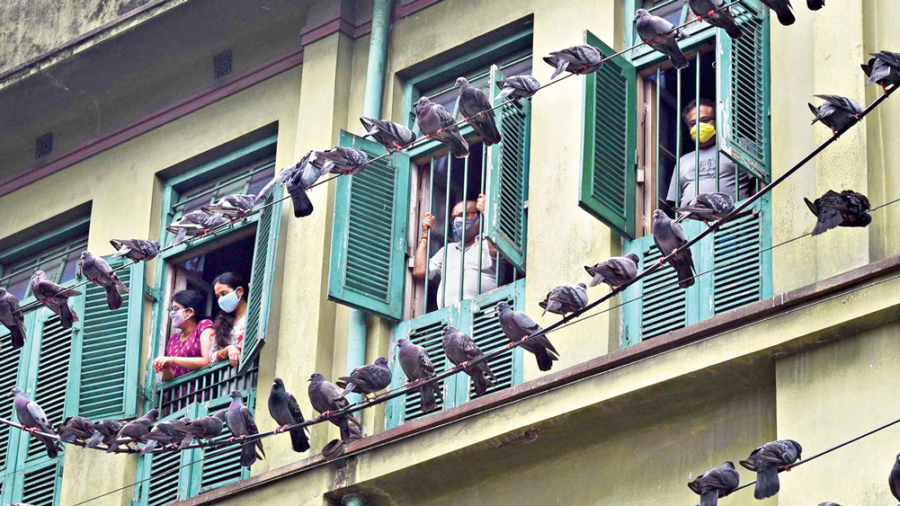 পথ চেয়ে: জানলা দিয়েই শহর-দর্শন কলকাতার বিবেকানন্দ রোডের বাসিন্দাদের। ছবি: সুমন বল্লভ
