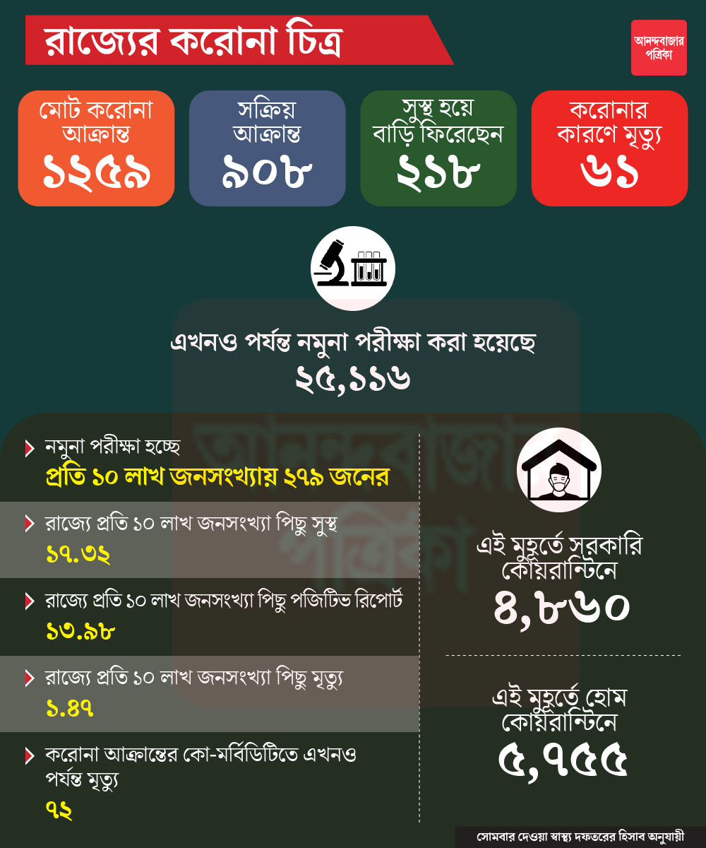 রাজ্যে এখনও পর্যন্ত করোনা আক্রান্ত হয়েছেন ১হাজার২৫৯ জন। তাঁদের মধ্যে ৯০৮ জন এখনও চিকিৎসাধীন।করোনায় এখনও পর্যন্তমারা গিয়েছেন ৬১ জন। রোগমুক্ত হয়েছেন ২১৮ জন। রাজ্যের করোনা পরিস্থিতি নিয়ে সোমবার এমন তথ্যই নবান্নে জানালেন রাজীব সিংহ।