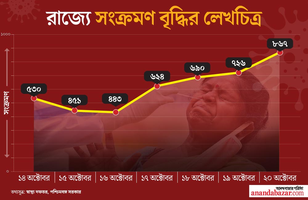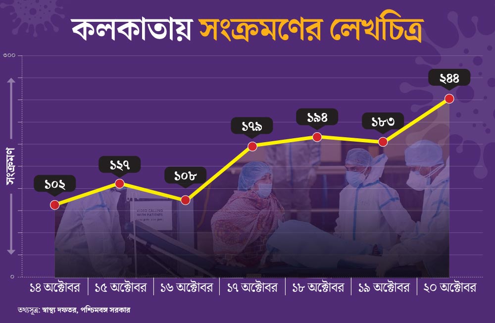 গত বৃহস্পতিবার রাজ্যে করোনা আক্রান্তের সংখ্যা ছিল ৫৩০। মাঝখানের দু’দিন সামান্য কমলেও রবিবার থেকে তা ফের ঊর্ধ্বমুখী। রাজ্য স্বাস্থ্য দফতর প্রকাশিত বুলেটিন অনুযায়ী, রবিবার রাজ্যে করোনা আক্রান্তের সংখ্যা ছিল ৬২৪। সোমবার তা বেড়ে হয় ৬৯০। এবং মঙ্গলবার সেই সংখ্যাই পৌঁছয় ৭২৬-এ। বুধবার আবার এক লাফে আক্রান্তের সংখ্যা বেড়ে দাঁড়ায় ৮৬৭। সবচেয়ে খারাপ অবস্থা শহর কলকাতার। গত বৃহস্পতিবার কলকাতায় করোনা সংক্রমণ ছিল ১০২। বুধবার তা পৌঁছেছে ২৪৪-এ। অর্থাৎ দ্বিগুণেরও বেশি। বৃহস্পতিবার কলকাতা পুরসভা জানিয়েছে, গত ২৪ ঘণ্টায় ২৬০ জন করোনা আক্রান্ত হয়েছেন শহরে। পুরসভার দেওয়া তথ্যে সব থেকে উদ্বেগের বিষয়, দ্বিতীয় টিকা নেওয়ার পরেও শুধু কলকাতায় ১৬৩ জন করোনা আক্রান্ত হয়েছেন। সব মিলিয়ে রাজ্যের কোভিড পরিস্থিতি নিয়ে চিন্তিত চিকিৎসক মহলও।