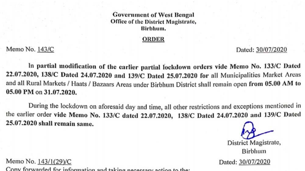 রাজ্য সরকারের ঘোষণা মতো সপ্তাহে দু’দিন লকডাউন ছিলই। পাশাপাশি সংক্রমণ রুখতে ২২ জুলাই থেকে টানা ৮ দিন বীরভূমে ছ’টি পুরশহরকে সময়ভিত্তিক বা আংশিক লকডাউনের আওতায় এনেছে প্রশাসন। দুপুর ১২টা থেকে রাত দশটা পর্যন্ত এই লকডাউনের আওতায় ছটি পুর এলাকা ছাড়াও প্রতিটি ব্লকের বিভিন্ন বাজার হাট রয়েছে। প্রশাসন চেয়েছে, পুর এলাকা এবং জেলার বাজার হাটে যেখানে লোকসমাগম বেশি হয়, সেই জমায়েত বন্ধ করতে। যে সময়টুকু বাজারহাট খোলা থাকছিল সেই সময়েও কড়া নজরদারি চালিয়েছে পুলিশ।