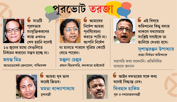 রাজ্য সরকার আদালতে আবেদন জানিয়ে বলেছিল, পুরসভার সংযুক্তিকরণের কাজ বাকি রয়েছে। তাই নির্বাচনের দিনক্ষণ পিছিয়ে দেওয়া হোক। কিন্তু হাইকোর্ট শুক্রবার স্পষ্ট বলে দিল, প্রাকৃতিক বিপর্যয় ছাড়া ভোট পিছিয়ে দেওয়ার নিয়ম নেই। সুপ্রিম কোর্টের তেমনই নির্দেশ রয়েছে। অতএব আদালতে পূর্বনির্ধারিত দিনক্ষণ অনুযায়ী ১৬ জুনের মধ্যেই ভোট করতে হবে রাজ্যকে। রাজ্যের অ্যাডভোকেট জেনারেল জয়ন্ত মিত্রকে উদ্দেশ করে প্রধান বিচারপতি মঞ্জুলা চেল্লুর এ দিন বলেন, ‘‘আপনি আমাদের নির্দেশ না মানতে পারলে সুপ্রিম কোর্টে যেতে পারেন।’’ আর, রাজ্য নির্বাচন কমিশনের আইনজীবী নয়নচাঁদ বিহানীর প্রতি প্রধান বিচারপতির নির্দেশ, ‘‘কমিশনকে