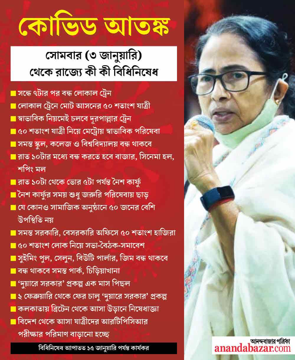 রাজ্যে লাফিয়ে বাড়ছে করোনা আক্রান্তের সংখ্যা। বাংলায় গত চার দিনে চার গুণ বৃদ্ধি পেয়েছে সংক্রমণ। এই পরিস্থিতিতে বাতিল হয়েছে একাধিক সরকারি অনুষ্ঠান। পাশাপাশি, রবিবার নবান্নে জরুরি বৈঠক শেষে আরও বেশ কিছু বিধিনিষেধের কথা ঘোষণা করেন রাজ্যের মুখ্যসচিব হরিকৃষ্ণ দ্বিবেদী। তিনি জানান, সোমবার থেকে রাজ্যের সমস্ত স্কুল, কলেজ ও বিশ্ববিদ্যালয় বন্ধ থাকবে। সন্ধে ৭টা পর্যন্ত লোকাল ট্রেন চলবে, তবে মোট যাত্রী আসনের ৫০ শতাংশ যাত্রী নিয়ে।