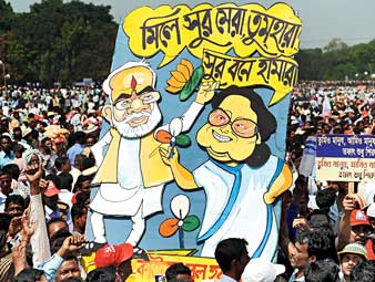 ব্যঙ্গচিত্রে মোদী-মমতা। রবিবার ব্রিগেডে সিপিএমের সভায় দেখা গেল এমনই কিছু পোস্টার। নিজস্ব চিত্র