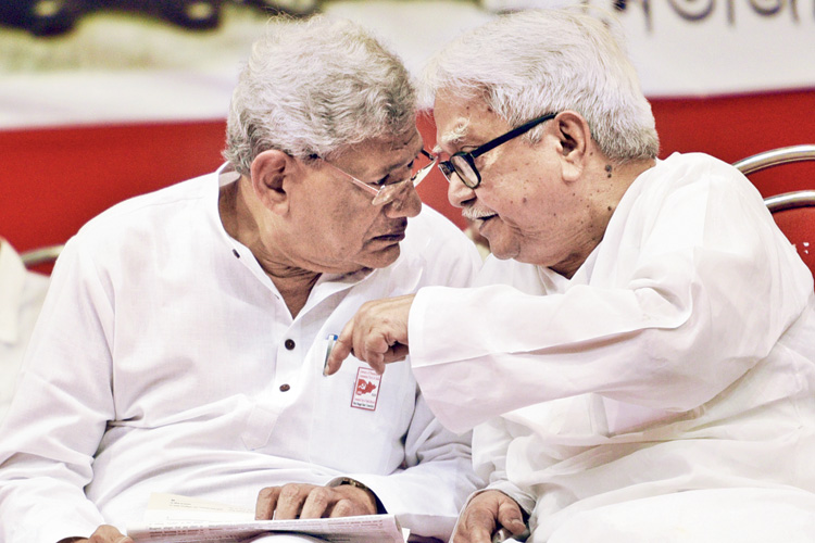 কমরেড: ভারতের কমিউনিস্ট পার্টি প্রতিষ্ঠার শতবর্ষ পূর্তির অনুষ্ঠানে সীতারাম ইয়েচুরি এবং বিমান বসু। বৃহস্পতিবার নেতাজি ইন্ডোর স্টেডিয়ামে। ছবি: সুমন বল্লভ