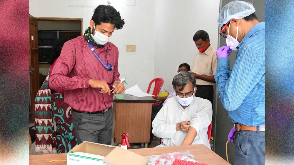 করোনা আবহে এই প্রথম কোনও রাজনৈতিক দল তার সংগঠনের অন্দরে অ্যান্টিবডি পরীক্ষা করাল। প্রমোদ দাশগুপ্ত ভবনে শুক্রবার সিপিএমের রাজ্য কমিটির বৈঠকে উপস্থিত সব সদস্যের রক্তের নমুনা সংগ্রহ করা হয়েছে অ্যান্টিবডি পরীক্ষার জন্য। যে সংস্থা পরীক্ষা করাচ্ছে, কারা রিপোর্ট পাঠাবে সিপিএম দফতরে। আলিমুদ্দিন স্ট্রিট রিপোর্টের প্রতিলিপি দেবে সদস্যদের। দলের রাজ্য সম্পাদক তথা চিকিৎসর সূর্যকান্ত মিশ্রের ভাবনাতেই এমন উদ্যোগ বলে দলীয় সূত্রের খবর। — নিজস্ব চিত্র