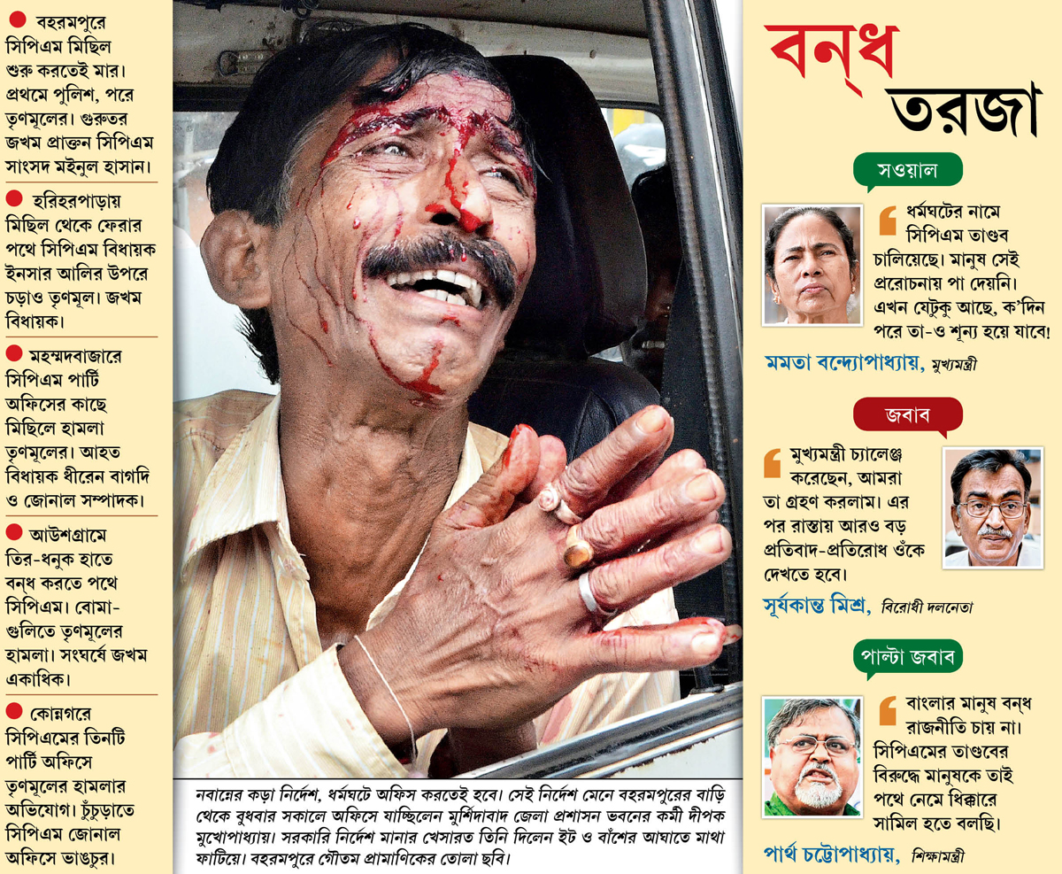 করার আগেই অবশ্য বামফ্রন্টের চেয়ারম্যান বিমান বসু জানিয়ে দিয়েছেন, ধর্মঘট ভাঙার নামে শাসক দল ও পুলিশের অত্যাচারের বিরুদ্ধে আজ ১৭টি বাম দল রাজ্য জুড়ে ‘প্রতিবাদ দিবস’ পালন করবে। যার অর্থ আজ আবার রাস্তায় পরস্পরের বিরুদ্ধে সেই বাম ও তৃণমূল!