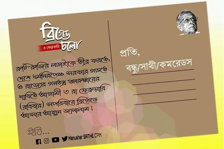 ‘মেহনতী মানুষ সরিবার ব্রিগেডে আসুন’, এই আমন্ত্রণ জানিয়ে সামাজিক মাধ্যমেই ছাড়া হয়েছে আমন্ত্রণপত্র। ‘বন্ধু’ যাতে ‘পথের সাথী’কে চিনে নেন, তার জন্য ছাড়া হয়েছে পোস্টকার্ডও। সামাজিক মাধ্যমে এই অভিনব উদ্যোগের পাশাপাশিই এলাকায় এলাকায় হাটে-বাজারে তোলা হয়েছে চাঁদা। দুই ২৪ পরগনা, হাওড়া ও হুগলি জেলায় সংগ্রহ করা হয়েছে চাল, ডাল, আনাজ। দূরের জেলার মানুষ শুক্রবার রাত থেকে শহরে আসতে শুরু করছেন। তাঁদের খাওয়া-দাওয়া ব্যবস্থা হয়েছে গণসংগ্রহ থেকেই।