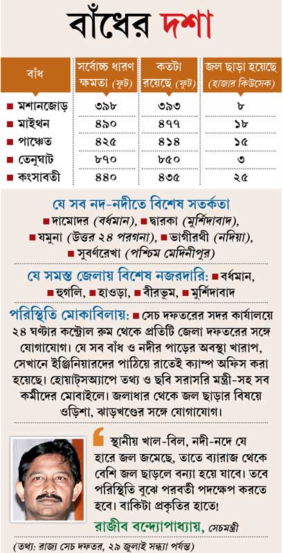 হাওড়াতেও জলের নীচে চলে গিয়েছে উদয়নারায়ণপুর, শ্যামপুর, আমতা, ডোমজুড়, জগৎবল্লভপুরের প্রচুর জমি। পূর্ব মেদিনীপুরের মহিষাদল, ভগবানপুর, পটাশপুর ও এগরাতেও বেশির ভাগ জমি জলমগ্ন। আমনের বীজতলা, আউশ ধানের জন্য রোয়া জমি, সব্জি, ফুল, পান, মাছ চাষের পুকুর— সবই ডুবেছে। পশ্চিম মেদিনীপুরে প্রায় সব ব্লকেই বর্ষায় পটল, ঝিঙে, বেগুন, কুঁদরি, কুমড়োর চাষ হয়। সেগুলির ক্ষতির আশঙ্কা তো আছেই। ক্ষতির হতে পারে বর্ষাকালীন পেঁয়াজেরও।