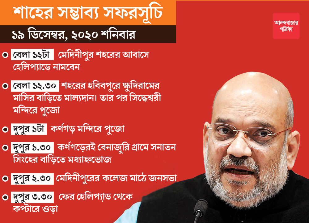 শনিবার দিনভর কর্মসূচি নিয়ে মেদিনীপুরে আসছেন কেন্দ্রীয় স্বরাষ্ট্রমন্ত্রী অমিত শাহ। মূল লক্ষ্য জনসভা হলেও তিনি শহরের দর্শনীয় স্থান গুলি ঘুরে দেখবেন। পুলিশ প্রশাসন ও দলীয় সূত্রে জানা গিয়েছে, দিল্লি থেকে কলকাতা বা কলাইকুণ্ডা হয়ে হেলিকপ্টারে করে অমিত শাহ আসবেন মেদিনীপুরে। দুপুর ১২টা নাগাদ তার আসার কথা। সেখান থেকে সড়ক পথে হবিবপুরে ক্ষুদিরামের মাসির বাড়িতে যাবেন। ক্ষুদিরামের মূর্তিতে মাল্যদান করবেন। সেই মতো পরিবারের এক সদস্যর সাথে কথা বলে রেখেছেন বিজেপির জেলা নেতারা। একটি মঞ্চ তৈরি হচ্ছে সেখানে। তার ঠিক উল্টো দিকেই রয়েছে সিদ্ধেশ্বরী কালী মন্দির। সেই মন্দিরে পুজো দেবেন তিনি। সেখান থেকে যাবেন ৯ কিমি দূরে কর্ণগড় মন্দিরে।