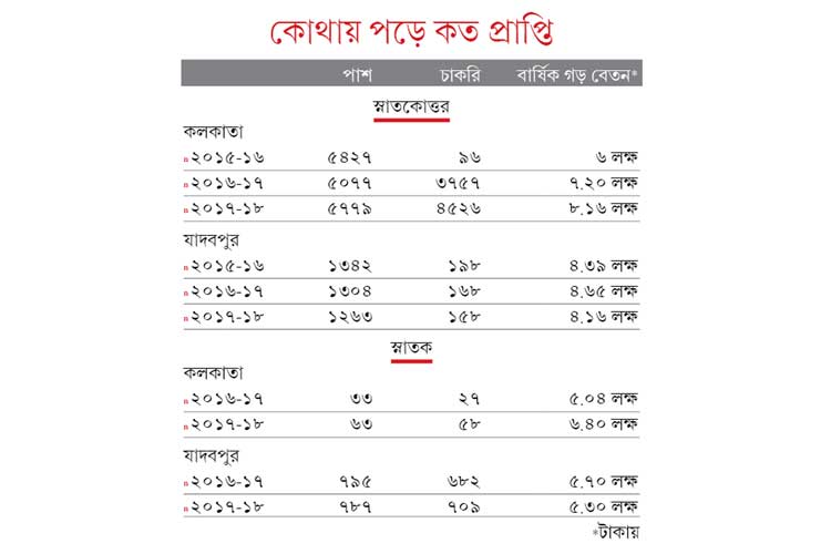 যাদবপুরে চার বছরের স্নাতক কোর্স বলতে মূলত ইঞ্জিনিয়ারিং। জয়েন্ট এন্ট্রান্সে সেরা সফল পড়ুয়ারা ভর্তি হন সেখানে। তাঁদের অধিকাংশই ক্যাম্পাসিংয়ে চাকরি পেয়ে যান। এনআইআরএফের তথ্য বলছে, সেখানেও বেতনের ক্ষেত্রে কলকাতার থেকে যাদবপুর পিছিয়ে। কলকাতায় ২০১৬-১৭ সালে ৩৩ জন পাশ করে চাকরি পেয়েছেন ২৭ জন। বছরে গড় মাইনে পাঁচ লক্ষ চার হাজার টাকা। ২০১৭-১৮ সালে তা বেড়ে হয়েছে ছ’লক্ষ ৪০ হাজার। যাদবপুরে ২০১৬-১৭ সালে চার বছরের স্নাতক কোর্স পাশ করা পড়ুয়াদের গড় বেতন ছিল পাঁচ লক্ষ ৭০ হাজার টাকা। ২০১৭-১৮ সালে তা কমে গিয়েছে। যাদবপুরে প্লেসমেন্ট সেল রয়েছে কয়েক বছর ধরে। কলকাতায় সেই অর্থে প্লেসমেন্ট সেল নেই। এর জন্য কয়েক জন কর্মী নিয়োগের সিদ্ধান্ত হলেও নিয়োগ হয়নি বলে বিশ্ববিদ্যালয় সূত্রের খবর।