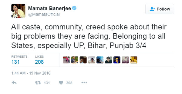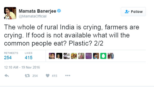 নোট বাতিল কাণ্ডে টুইটারেও আক্রমণাত্মক মুখ্যমন্ত্রী। সেখানে তিনি লিখেছেন, ‘‘সেভিংস অ্যাকাউন্ট থেকে টাকা তোলাতেও বিধিনিষেধ জারি করা হয়েছে। সাধারণ মানুষের টাকা সুরক্ষিত আছে তো? গোটা দেশ জানতে চাইছে। গ্রামের মানুষ কাঁদছে। কৃষকরা কাঁদছে। মানুষ খাবে কী? প্লাস্টিক?’’