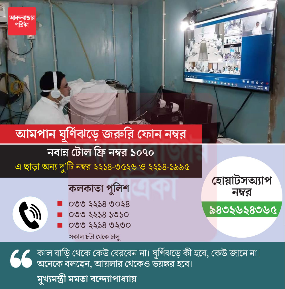 • আমপানের প্রভাবে বুধবার ভারী থেকে অতি ভারী বৃষ্টি হবে পশ্চিম মেদিনীপুর, উত্তর ও দক্ষিণ ২৪ পরগনা, হাওড়া, হুগলি এবং কলকাতায়।