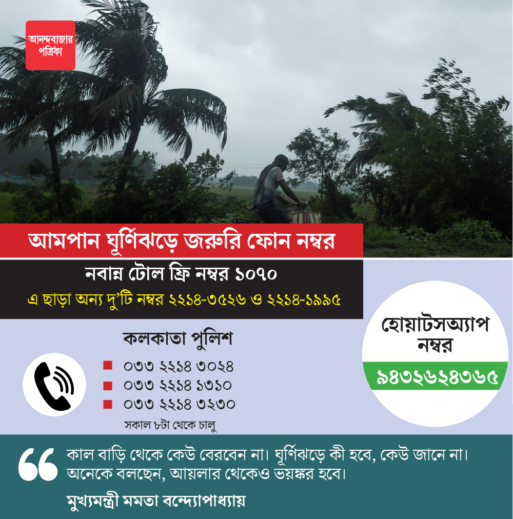 আমপানের মোকাবিলায় রাজ্য সরকার সব ধরনের প্রস্তুতি নিয়ে রেখেছে। ইতিমধ্যেই তিন লক্ষ মানুষকে সাইক্লোন সেন্টার-সহ নিরাপদ আশ্রয়ে সরিয়ে আনা হয়েছে। পরিস্থিতি মোকাবিলায় জাতীয় বিপর্যয় মোকাবিলা বাহিনী (এনডিআরএ)-ও উপকূলবর্তী-সহ বিভিন্ন জেলায় প্রস্তুত। নবান্নে চালু রয়েছে কন্ট্রোল রুমও। মুখ্যমন্ত্রী মমতা বন্দ্যোপাধ্যায় নিজে নবান্ন উপস্থিত থেকে গোটা পরিস্থিতি পর্যবেক্ষণ করবেন। এবং প্রয়োজনে নির্দেশও দেবেন সেখান থেকে। রাজ্যবাসীর উদ্দেশে আজ সারা দিনই ঘরে থাকার বার্তা দিয়েছেন মুখ্যমন্ত্রী।