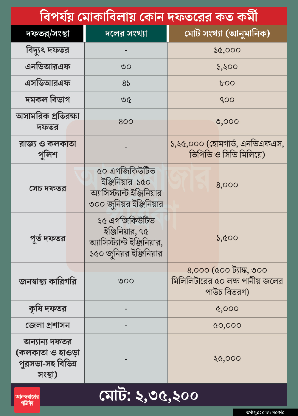এর সঙ্গে রাজ্যের কোন দফতরের কত কর্মী কাজ করছেন, তার একটি তালিকাও দিয়েছেন মুখ্যমন্ত্রী। রাজ্য সরকারের দেওয়া হিসাব অনুযায়ী,আমপান বিধ্বস্ত এলাকায় প্রায় ২ লাখ ৩৫ হাজার ২০০ জন কর্মী কাজ করছেন। এর মধ্যে জাতীয় বিপর্যয় মোকাবিলা বাহিনীর ৩০টি দলের ১,২০০ সদস্যকে বাদ দিলে বাকি প্রায় পুরোটাই রাজ্য সরকারি কর্মী। এই কর্মীদের কাজের প্রশংসা করেছেন মমতা বন্দ্যোপাধ্যায়।