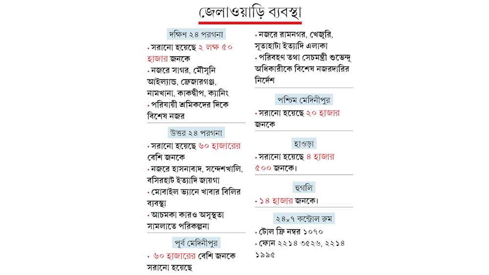 দক্ষিণ ও উত্তর ২৪ পরগনা এবং দুই মেদিনীপুর থেকে অন্তত চার লক্ষ মানুষকে আশ্রয় শিবিরে নিয়ে যাওয়া হয়েছে বলে জানান মুখ্যমন্ত্রী। কোনও প্রয়োজন হলে নবান্নের কন্ট্রোল রুমে (তিনটি নম্বর: ১০৭০, ২২১৪-৩৫২৬, ২২১৪-১৯৯৫) ফোন করে সরকারকে জানাতে অনুরোধ করেন তিনি।