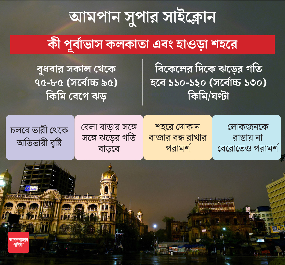 মঙ্গলবার আবহাওয়া দফতরের ডেপুটি ডিরেক্টর জেনারেল সঞ্জীব বন্দ্যোপাধ্যায় জানান, ঘূর্ণিঝড় এবং প্রবল বৃষ্টির বিপদ থেকে বাঁচতে বুধবার কলকাতায় দোকানপাট বন্ধ রাখার জন্য রাজ্য সরকারকে পরামর্শ দেওয়া হয়েছে। কলকাতা পুলিশ মাইকে প্রচার করছে, বাসিন্দারা যেন বাড়ি থেকে না-বেরোন। দোকান খুলতে বারণ করা হচ্ছে দোকানিদের।