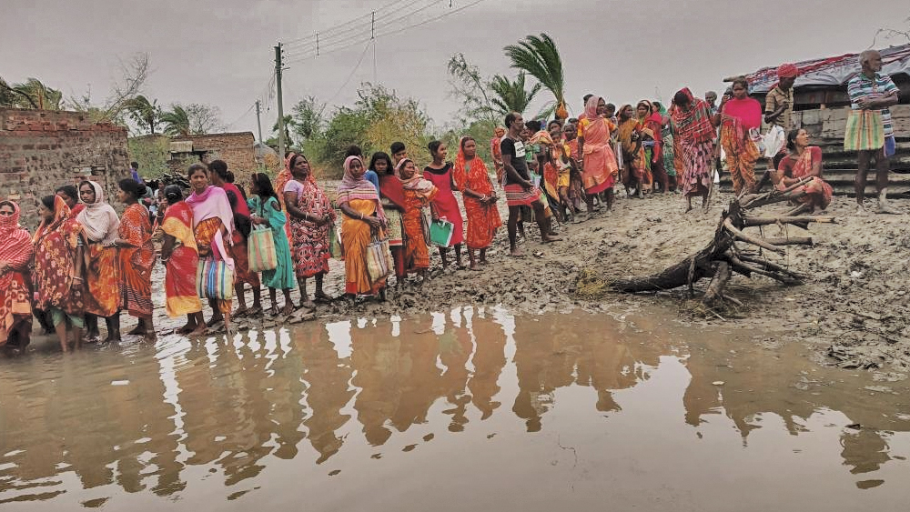 আমপানের পর ১০ দিন হয়ে গেল। আজও জল থইথই করছে দুই ২৪ পরগনার অনেক গ্রাম। দক্ষিণে গোসাবা থেকে শুরু করে উত্তরের চকপাটলি— বহু গ্রাম এখনও ভেসে আছে সেই ২১ তারিখ থেকে। অনেক জায়গায় মাটির বস্তা ইত্যাদি দিয়ে নদীর ভাঙা বাঁধে জোড়াতালি দেওয়া হলেও, অনেক জায়গাতে সেটুকুও হয়নি। ফলে নদীর সঙ্গে জোয়ার-ভাটা খেলে চলেছে গ্রামে গ্রামে।