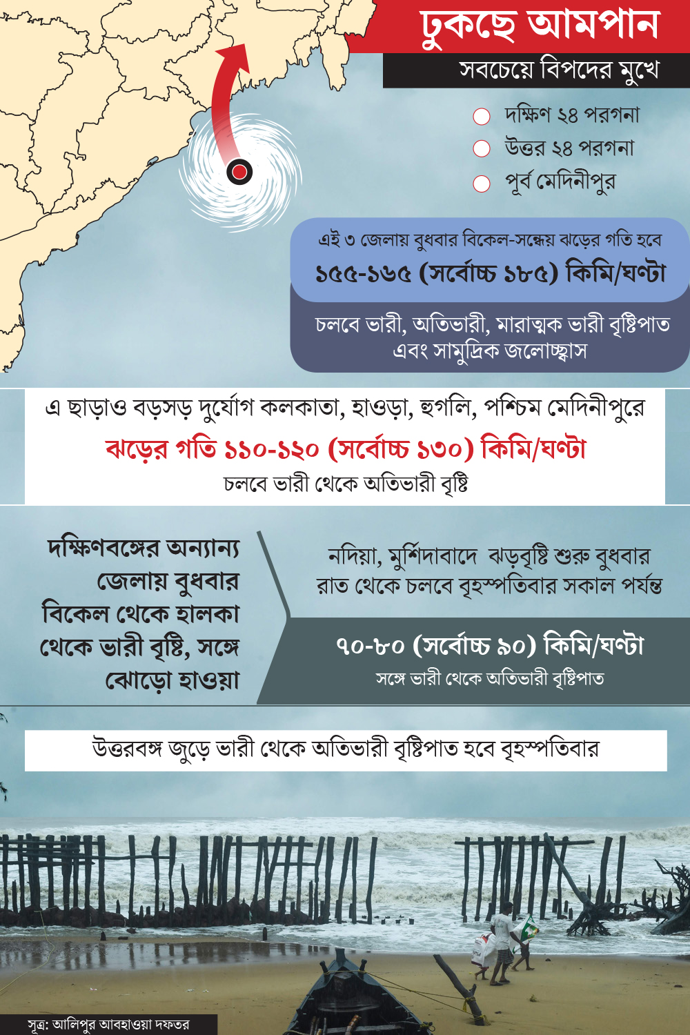 আজ বুধবার বিকেলে ১৫৫ থেকে ১৮০ কিলোমিটার বেগে ‘অতি মারাত্মক ঘূর্ণিঝড়’ হিসেবে আছড়ে পড়বে আমপান (প্রকৃত উচ্চারণ উম পুন)। বুধবার দুপুরে আলিপুর আবহাওয়া দফতরের পূর্বাভাসে বলা হয়েছে, বকখালি ও সাগরদ্বীপের মাঝামাঝি কোনও এলাকায় স্থলভাগে আছড়ে পড়তে চলেছে আমপান। স্থলভাগে আছড়ে পড়ার পর বৃহস্পতিবার সকাল পর্যন্ত ঘূর্ণিঝড়ের দাপট থাকবে। সঙ্গে চলবে ভারী, অতিভারী, বা অতিপ্রবল বৃষ্টিপাত। আবহবিদরা জানিয়েছেন, উপকূলীয় তিন জেলায় ঘূর্ণিঝড়ের গতিবেগ থাকবে ঘণ্টায় ১৫৫ থেকে ১৬৫ কিলোমিটার। সর্বোচ্চ গতিবেগ হতে পারে ঘণ্টায় ১৮৫ কিলোমিটার পর্যন্ত। পাশাপাশি জলোচ্ছ্বাসও থাকবে সমুদ্রে। দুই ২৪ পরগনায় ঢেউয়ের উচ্চতা হবে ৪ থেকে ৫ মিটার। পূর্ব মেদিনীপুরের উপকূলীয় এলাকায় ঢেউ হবে ৩-৪ মিটার উঁচু।