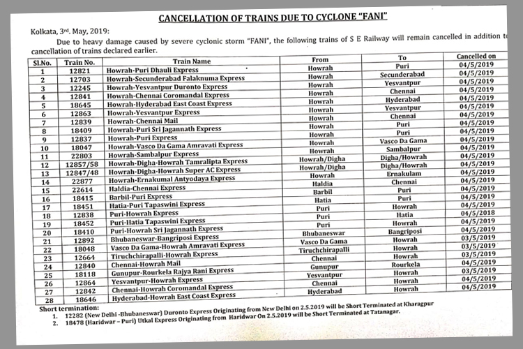 ফণীর তাণ্ডবে ইতিমধ্যেই দক্ষিণ ভারত, ওড়িশা এবং পশ্চিমবঙ্গের মধ্যে ইস্ট কোস্ট এবং দক্ষিণ-পূর্ব রেলের বিভিন্ন শাখায় ১৮০টি ট্রেন বাতিল হয়েছে। শুক্রবার সন্ধ্যায় ২৮টি ট্রেন বাতিল করেছে দক্ষিণ-পূর্ব রেল। ফণীর তাণ্ডবে ভূবনেশ্বরে বিমান ওঠানামাও বন্ধ রয়েছে।