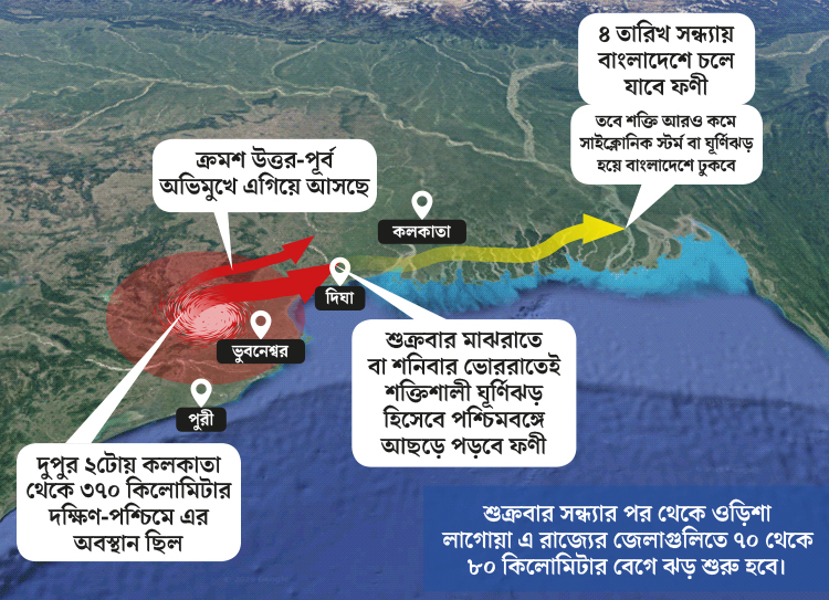 শুক্রবার সকাল ৯টা নাগাদ ওড়িশা উপকূলে আছড়ে পড়ে অতি শক্তিশালী ঘূর্ণিঝড় ফণী। স্থলভাগে ঢুকে পড়ে তার অভিমুখ হয় উত্তর-পূর্ব দিকে। এ দিন দুপুর ২টো নাগাদ ফণীর অবস্থান ছিল ওড়িশার ভুবনেশ্বরে। দিঘা থেকে প্রায় ২২৭ কিলোমিটার দক্ষিণ-পশ্চিমে রয়েছে। কলকাতা থেকে অবস্থান প্রায় ৩৭০ কিলোমিটার দক্ষিণ-পশ্চিমে। পশ্চিমবঙ্গে ঢোকার মুখে অনেকটাই শক্তি হারাবে ফণী। আবহাওয়া বিজ্ঞানীদের দাবি, এ রাজ্যে ঢোকার সময় ফণী শক্তিশালী ঘূর্ণিঝড়ের চেহারা নেবে।