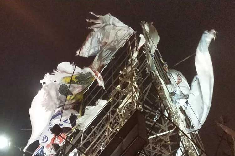 ঝোড়ো হাওয়ার দাপটে শহরে হোর্ডিং ছিঁড়ে গিয়েছে। নিজস্ব চিত্র।